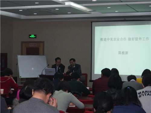 原驻美国使馆经商处一秘陈植新同志作了讲座。他结合自己多年驻外工作经历,以驻美工作为主线,围绕美国农业简况、美国农业政策调整、中美农业合作与农产品贸易、驻外农业外交官的职责和素质要求四个方面作了介绍。讲座内容丰富,案例鲜活生动,现场气氛热烈。参加人员表示,通过讲座开阔了眼界,增长了知识,不仅对驻外工作有了更深入的了解,也对作为一名外交官所要付出的努力和承担的责任有了更深刻的认识。
