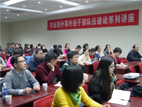 2014年2月21日,以“推进中美农业合作 做好驻外工作”为主题的农业部外事外经干部队伍建设系列讲座在京举办。参加讲座的有部国际合作司、人力资源开发中心、中国农业科学院、中国水产科学院、管理干部学院、对外经济合作中心、国际交流与服务中心等20余家单位的近80名干部。